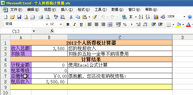 其次,通过基本的Excel操作,将表格设计成个人所得税计算器,如下图所示: