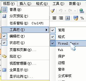 菜单栏:视图→工具栏→Visual Basic,打开VB工具栏(后面的Visual Basic,一律简称为VB)