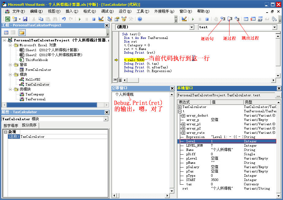 呵呵,通过本地窗口,可以发现我鼠标选中的那一行,读取的level属性是不对滴,因为在未调用calc函数之前,它应该是默认的0才是。我在TaxPersonal类模块中定义的pLevel有效值是-1到6(内部定义,方便计算,因为数组下标是从0开始计算的),但给别人看的属性level是国家法律中规定的1到7。