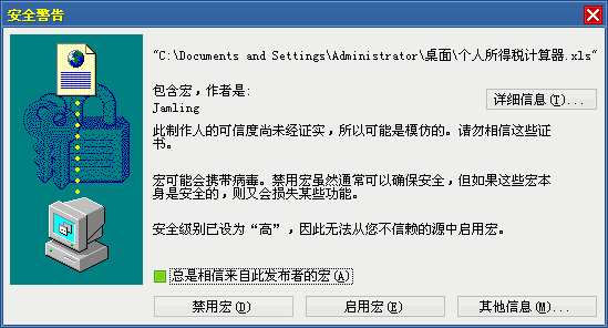签名之后,在打开有宏的Excel时,会弹出一个警告框,如下图所示: