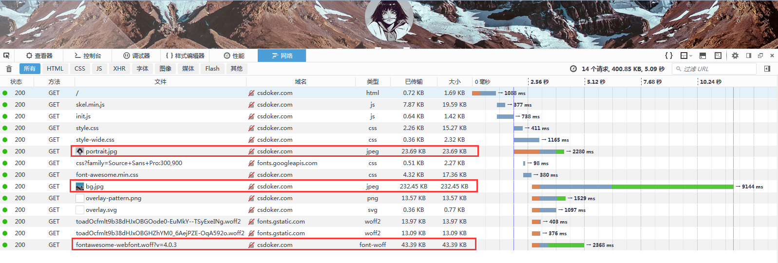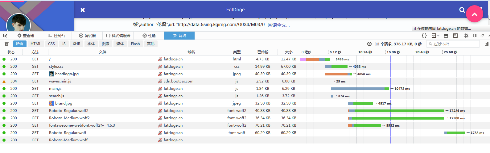 请求虽然少,只有14个,但是加载速度非常慢,主要是博客部署在github上,国内访问较慢,页面呈现用时5s,全部加载总用时11.74s。相对加载速度较慢的主要是背景,头像和字体文件。总体来说加载慢。