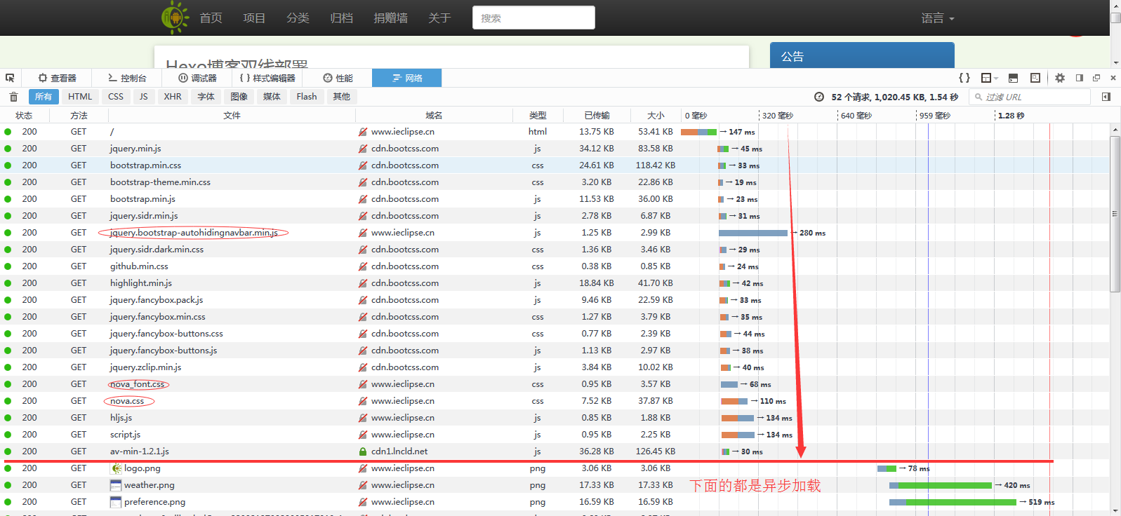 请求非常多,52个请求,页面加载用时427ms,加上其它的异步请求,总用时1.54s。相当于页面秒开。加载相对较慢的有nova.css和那个自动隐藏导航栏的js脚本。其它的像jq和bootstrap都使用了cdn,加载还是相当快的。