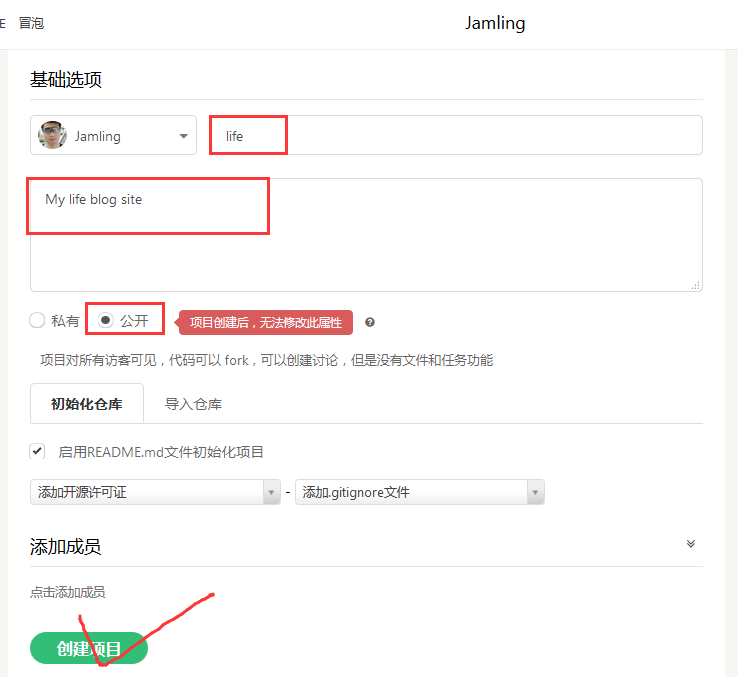 登录成功后,可以创建项目,在Hexo博客双线部署中,我介绍的是用户pages,在这里,我介绍项目pages,所以创建的是一个普通项目。创建过程如下所示: