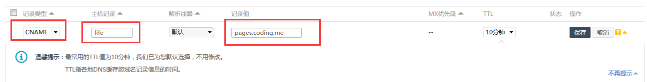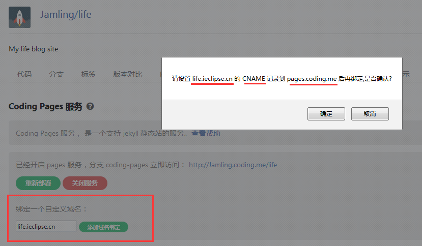添加一条CNAME的记录解析到pages.coding.me就可以了。