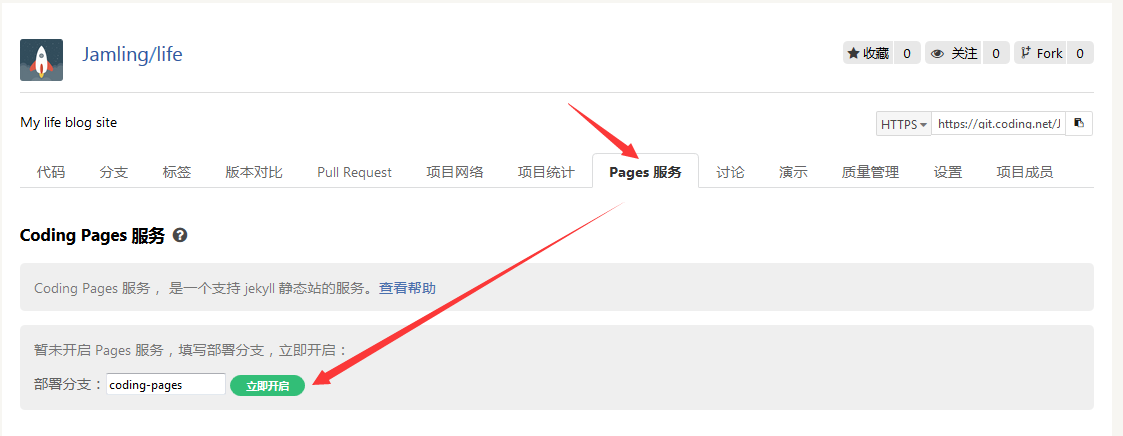参考Coding Pages 帮助,创建项目Pages。我使用master分支来存放hexo的源文件,站点生成之后,部署到coding-pages分支。简要的步骤如下: